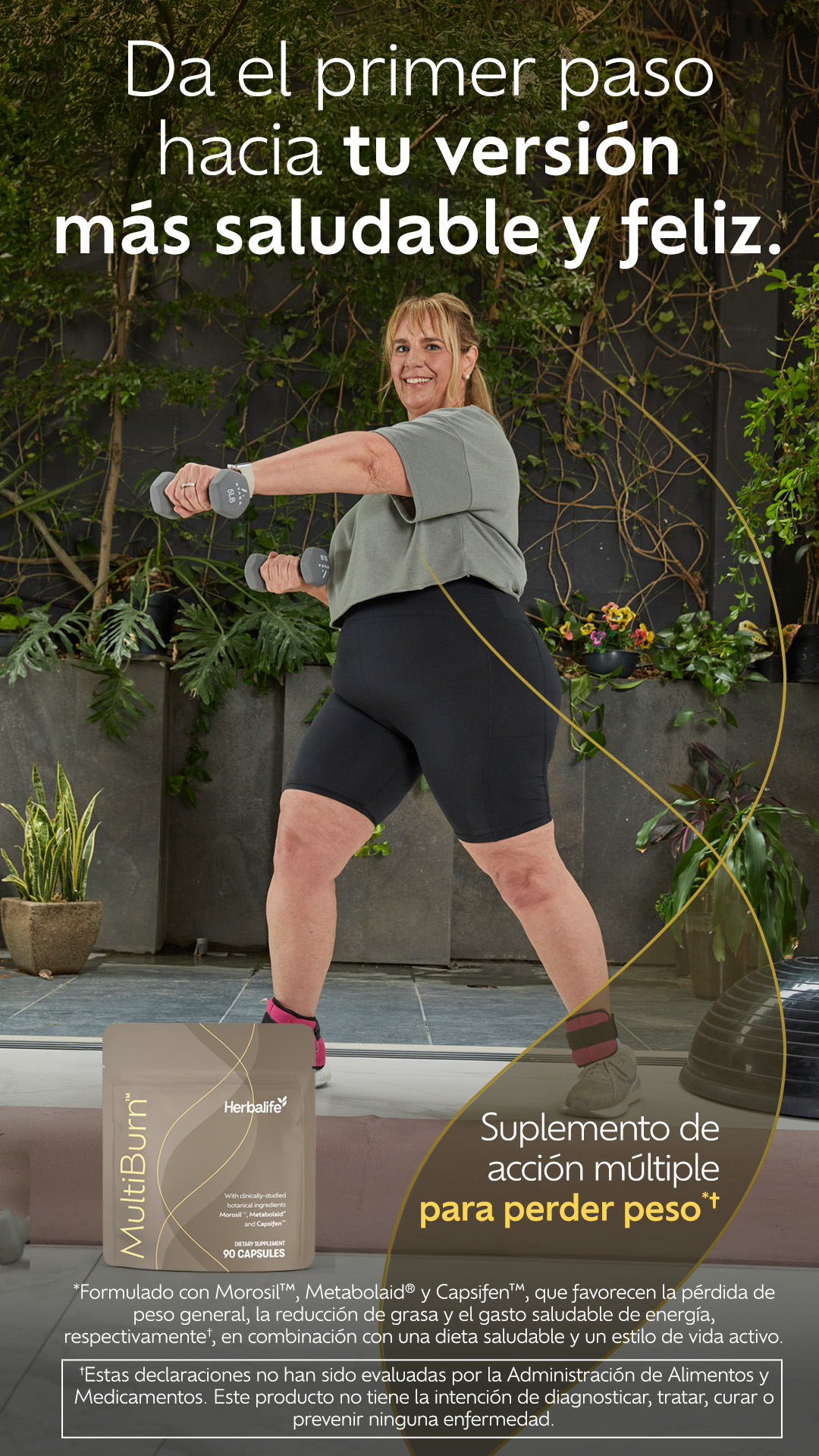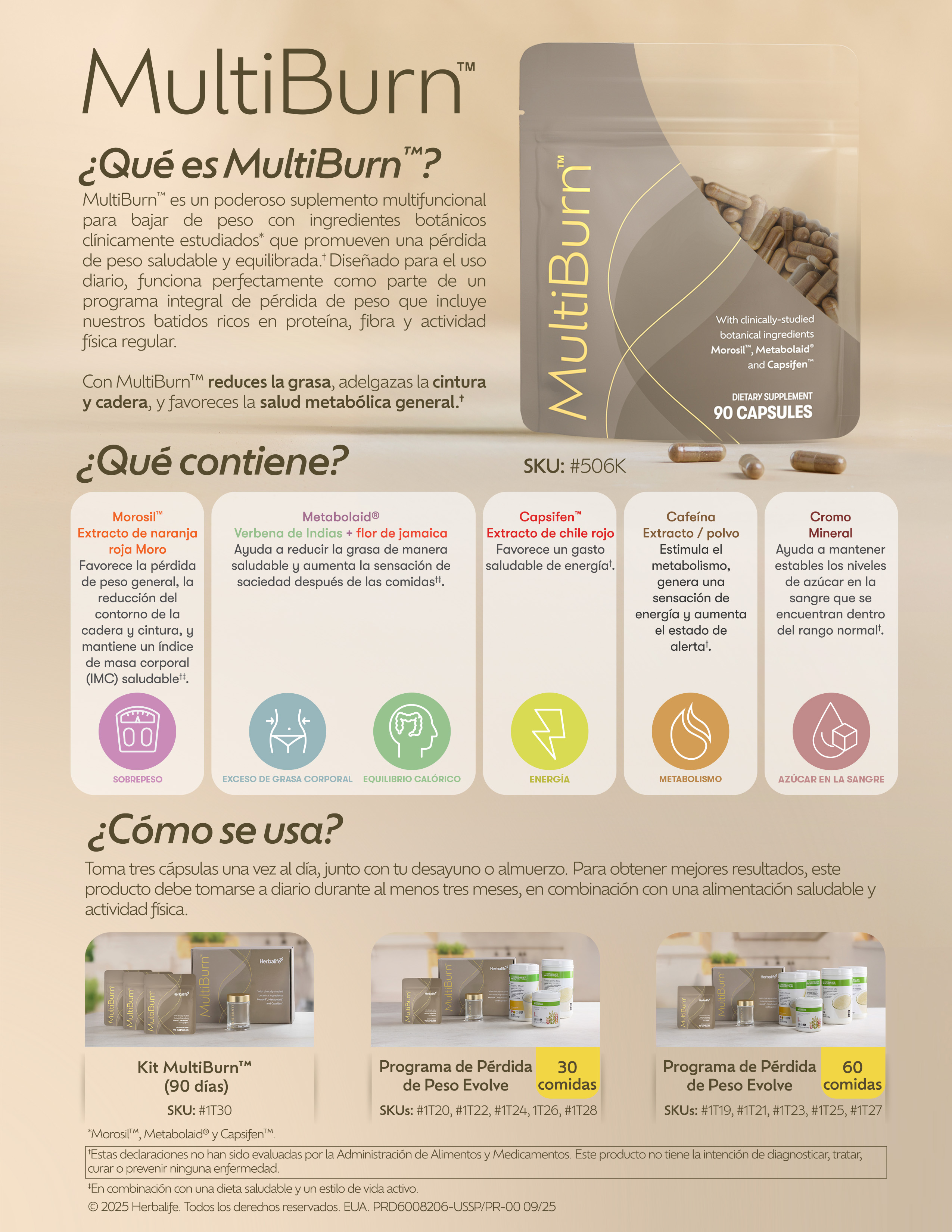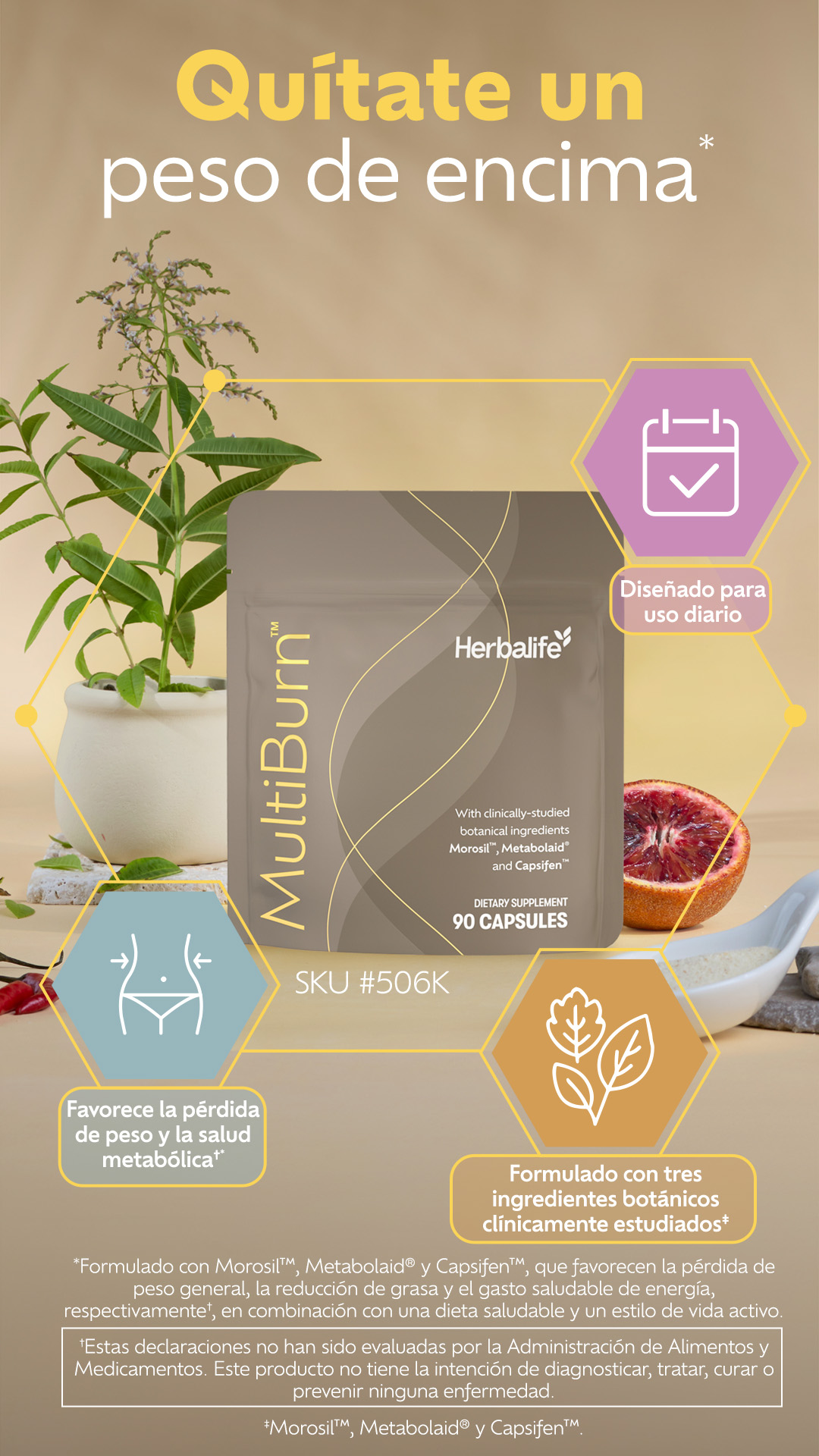 MultiBurn™ es un poderoso suplemento multifuncional para bajar de peso con ingredientes botánicos clínicamente estudiados* que promueven una pérdida de peso saludable y equilibrada.† Diseñado para el uso diario, funciona perfectamente como parte de un plan integral de pérdida de peso que incluye nuestros batidos ricos en proteína, fibra y actividad física regular. MultiBurn™ te ayuda a reducir la grasa corporal, afinar la cintura y las caderas, y favorecer una buena salud metabólica.†